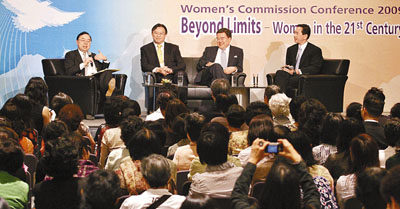 婦女事務委員會昨日舉行名為「承擔、超越—21世紀女性」的研討會,邀請了特首曾蔭權、中聯辦主任彭清華及中華全國婦女聯合會副主席、書記處書記陳秀榕主禮,陳秀榕和勞工及福利局局長張建宗分別發表專題演講。嚴肅、認真的主題演講外,大會亦搞搞新意思,特意找來3個大男人,分享對兩性平等的見解。對於這一「新」課題,胡定旭、陳啟宗及陳智思一開場都「自謙」沒有深入研究。