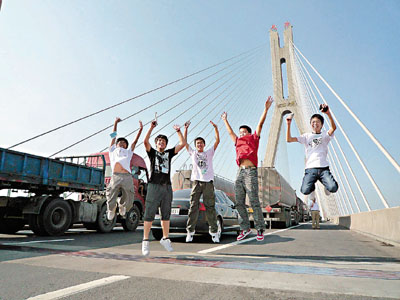 觀塘瑪利諾學生趁塞車時間,在天津一條大橋上拍照留念。