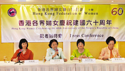 香港各界婦女國慶籌委會總召集人林貝聿嘉,顧問梁愛詩,聯席召集人雷羅慧洪、副召集人何超瓊昨日舉行記者會,介紹有關活動詳情。林貝聿嘉指出,新中國迎來甲子華誕,香港各界婦女去年已開始籌備各項國慶活動,本港150多個婦女團體齊心協力參與支持。