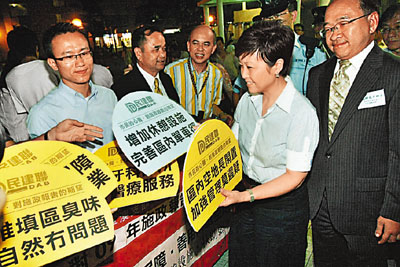 同時,民建聯代表反映,將軍澳堆填區的臭味問題持續,嚴重影響居民生活,促請政府盡快解決。亦有區議員指,區內有數百公頃空地長期空置,期望政府善用資源,發展更多綠化及利民的設施。潘潔回應指,香港受到金融海嘯的影響,經濟有待復甦,政府未來的施政重點是全力建設經濟。她又指,環境局已推出膠袋徵費等措施改善環境,及透過氣味關注組及俗稱「電子鼻」的電子氣味監察器,跟進堆填區臭味問題。 ■本報記者 曾少妍