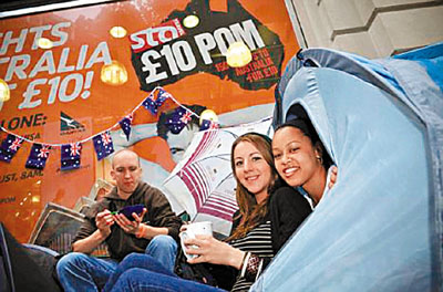 英 國STA Travel旅行社推出一百五十張僅售10英鎊(約127港元)的飛往澳洲超筍機票,立即引發搶購狂潮,大批青年在全國八間分店外通宵紮營五天,開售短短五十分鐘便賣掉全部特惠機票。