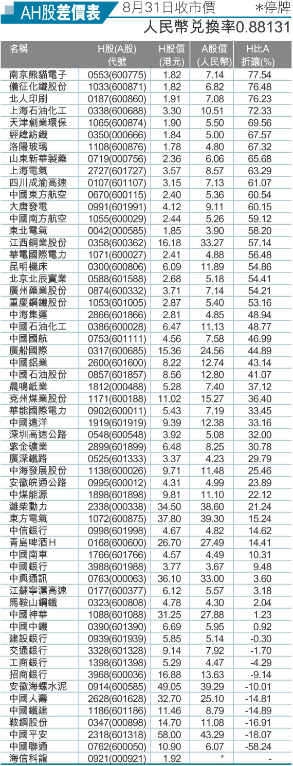 AH股差價表 8月31日收市價