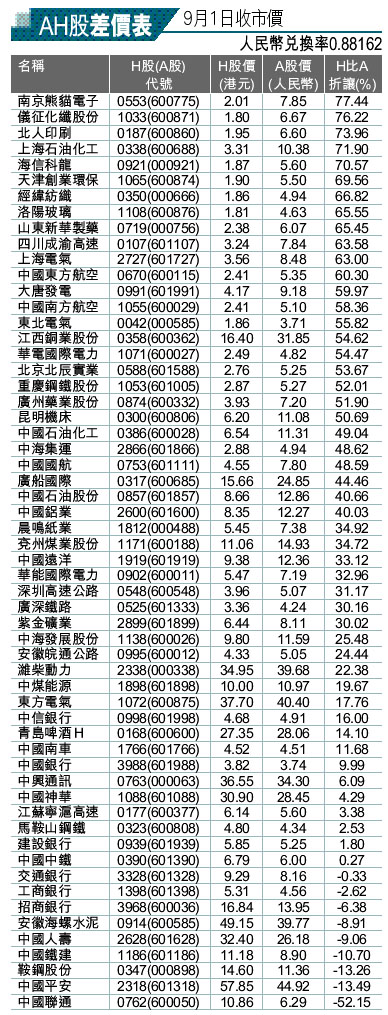 AH股差價表(9月1日收市價 人民幣兌換率0.88162)