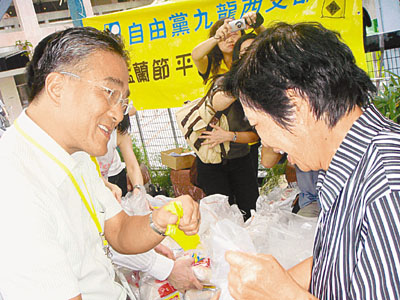 田北辰等昨日趁盂蘭節,在美孚地鐵站向區內長者分派300包平安米,不少人排隊輪候,氣氛熱鬧。他說,自由黨十分重視地區工作,要落實自由黨「兩條腿走路」的做法,而2011年區議會選舉將會是他們的考驗,又強調自由黨暫時不會考慮與其他黨派協調,以免有黨員因此而不去努力,「沒有壓力則沒有競爭」。