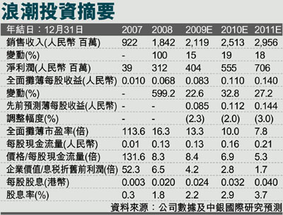 浪潮國際(0596)公告09年上半年淨利潤同比增長25%,這主要是受到ERP和電信業務的拉動。我們認為公司今後能夠獲得多維增長動力,並將受益於今年下半年受抑制IT支出需求的釋放。我們將每股收益預測小幅調低,並將目標價格由2.30港元下調至1.90港元(昨收0.92元)。儘管如此,我們對該股仍然維持買入評級。