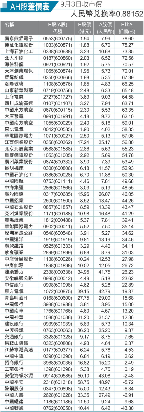 AH股差價表 9月3日收市價 (2009-09-04) (圖)