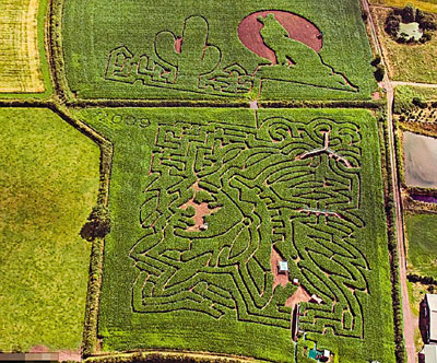 今年的迷宮建在特倫特河畔的伯頓附近,迷宮的路徑展現了美洲酋長頭戴羽飾、深情注視英國斯坦福郡鄉野的樣子,鄰近的田地則是一株巨大的仙人掌和一隻對月長嘯的郊狼,充滿西部風情。
