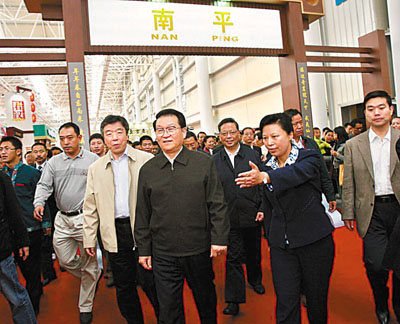 ■中共中央政治局常委李長春(前左三)在中共福建省委書記盧展工、福建省省長黃小晶、中共南平市委書記雷春美等陪同下,視察在武夷山市舉行的第二屆海峽兩岸茶業博覽會。 本報福建傳真