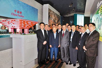 訪問團參觀上海世博會展館時在中國館模型前留影。相約2010年5月1日在中國館再相聚。
