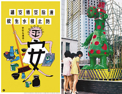 ■新聞處在60年代製作了一系列以「平安小姐」做主角的海報,宣傳健康及安全知識(左);1972年在中環放置大型垃圾蟲,宣傳「清潔香港」(右)。