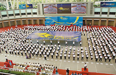 為慶祝成立125周年紀念,馬會將展開一系列活動,包括在本港各大型商場、工展會及彭福公園等地方舉行展覽,把不同時代香港與馬會交錯的歷史片段,一一重現市民眼前,更會推出紀念馬票。昨日,逾千名市民在沙田馬場集體示範「香港得得得」運動十式,並輔以十種健康正面的生活態度為口訣,鼓勵市民定期做運動鍛煉體魄、熱愛運動,保持身心健康。 本報記者聶曉輝 攝