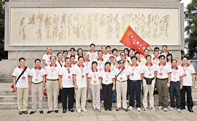 團員在刻有毛澤東詞《西江月—井岡山》的石壁前合影。 本報記者 潘達文井岡山傳真