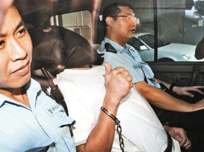 ■涉嫌淋鏹水的疑兇提堂後,被警方押走時,竟豎起拇指示威。