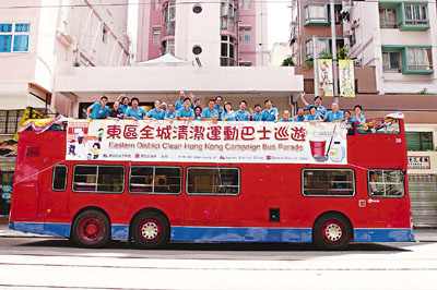 東區區議會日前舉行「東區全城清潔運動巴士巡遊」,東區區議會主席丁毓珠率領一眾東區區議員,乘坐宣傳巴士途經小西灣、柴灣、炮台山、北角等地,向市民派發清潔包,呼籲大家響應全城清潔運動,保持個人及環境衛生,攜手建設健康社區。