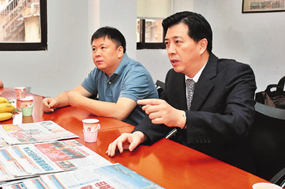 ■福建省政府新聞辦主任朱清(右)探訪本報駐閩辦事處並深入交談。 本報記者黃嵩 攝