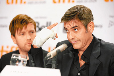 因被車門夾傷右手,佐治古尼最近出席兩個影展仍需用繃帶包紮傷口。雖然行動不便,但佐治不忘搞點氣氛讓大家開心一下,如記者會上他再拿其右手做出趣怪動作,讓現場氣氛相當輕鬆,這位鑽石王老五果然魅力非凡。