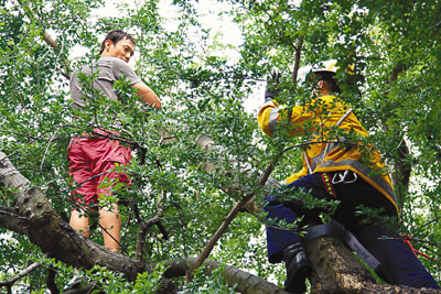 ■消防員攀上大樹拯救被困的鸚鵡男主人。