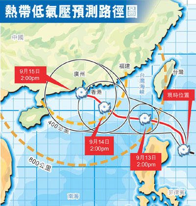 天文台署理高級科學主任鄭元中表示,位於菲律賓以東海域的低壓區昨日增強成為一個熱帶低氣壓,晚上8時集結在馬拉尼之東北約440公里,預料向西北移動,時速約20公里,今日將進入南海,大致移向呂宋海峽。根據天文台預測路徑,熱帶低氣壓今日會發展為熱帶氣旋,並進入本港800公里範圍,中心風力每小時可達65公里,熱帶氣旋會繼續增強,周二非常接近本港,預計在香港西南近距離掠過。