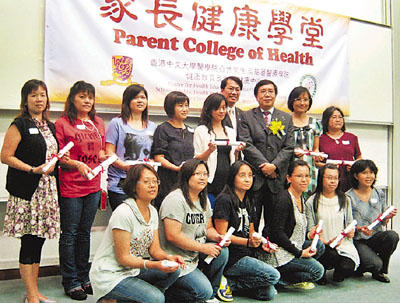 由中大醫學院健康教育及促進健康中心舉辦的「家長健康學堂」,較早前正式結業,並於昨日舉行畢業典禮。來自33間學校共107名畢業家長,在兩個月內接受了家居安全、健康飲食、親子溝通等範疇的課程培訓,把所學的知識,透過策劃推行到學校和社區,協助建立家庭健康生活文化。中心總監李大拔表示,學童成長多變,隨時出現濫藥、援交等問題,但只要家庭有凝聚力,便能提升家人的抗逆能力,社會問題亦能迎刃而解。