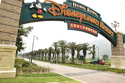 竹篙灣迪欣湖活動中心的入口處,有米奇老鼠在歡迎大家。
