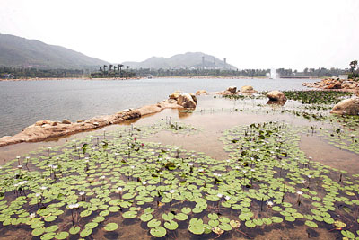 竹篙灣迪欣湖活動中心的湖面上,長滿浮萍,煞是好看。