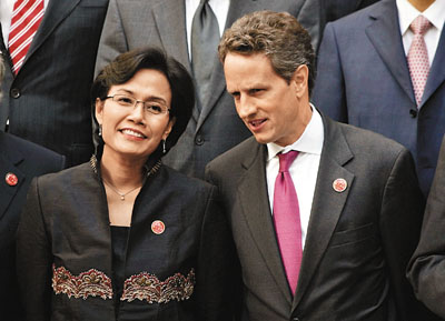 ■本月G20財長會議拍大合照時,印尼財政部長穆利亞妮(左) 被安排站在美國財長蓋特納身邊。