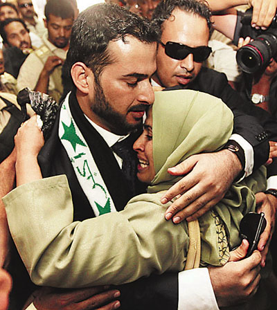 ■扎伊迪出獄後與一名姊妹相擁。路透社