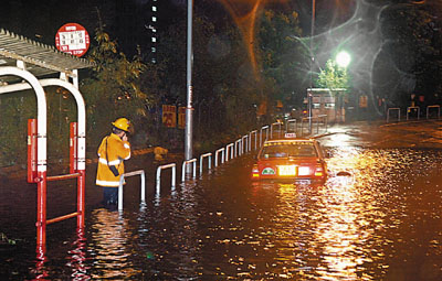 ■何文田忠孝街水浸,一輛的士被困水中央,消防員到場救援。
