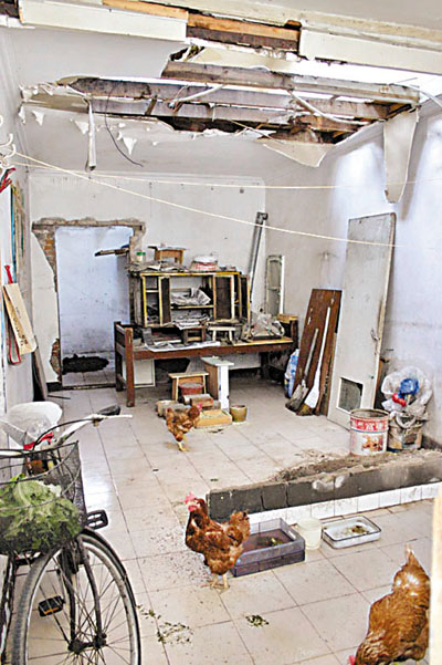 梁思成故居正房的內房頂坍塌,住戶在屋中養雞。