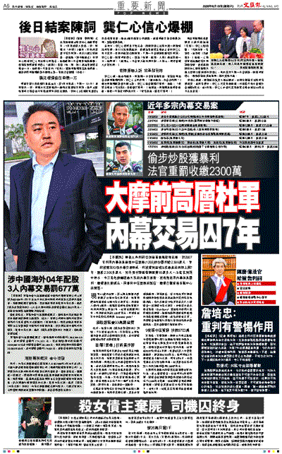 【本報訊】摩根士丹利前亞洲區董事總經理杜軍,於2007年利用內幕消息買賣中信資源(1205)股份圖利逾2,300萬元,早前被裁定10項內幕交易罪成,昨被重判區域法院最高的刑期上限7年,罰款2,300多萬元,另外要付證監會調查費93萬多元。法官在判詞中表示,今次是他接觸過最大宗的內幕交易案,被告刻意用內幕消息圖利,嚴重違反對僱主、同事和中信資源的誠信,嚴重打擊香港金融中心的聲譽。