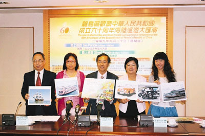 【本報訊】(記者 邱益忠)為慶祝中華人民共和國成立60周年,離島區議會斥資130萬元,於明天舉辦離島區歷來規模最大的「海陸巡遊大匯演」,預計可吸引至少1.5萬人參與,令東涌區食肆及店舖的生意比平日上升20%。最矚目的活動莫過於海上巡遊,仿古船、漁船、消防船等60艘具特色的船隻會駛經尖沙咀維多利亞港、星光大道、馬灣海峽一帶,讓市民近距離一睹船隻風采。