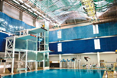 ■東亞運場地之一的九龍公園泳池頂部還未完工。 本報記者郭正謙 攝