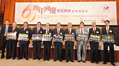 ■蔡冠深、張成雄、楊釗、陳幼南、林銘森、陳斌、袁武及李德麟等展示國慶煙花匯演圖示。
