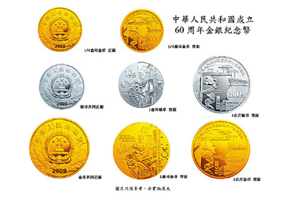 「六十年來一甲子,每逢甲子溯歷程」,為慶祝祖國六十華誕,中國人民銀行於近日發行「中華人民共和國成立60周年金銀紀念幣」一套。該套紀念幣包括3枚金幣(1公斤、5盎司及1/4盎司)和2枚銀幣(1公斤及1盎司),均為中華人民共和國法定貨幣,且限量發行。其中,1/4盎司金幣及1盎司銀幣套裝香港地區限售1000套。