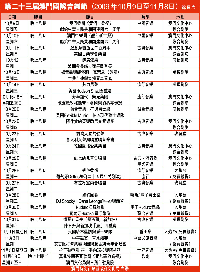 第二十三屆澳門國際音樂節(2009 年10月9日至11月8日)節目表 (圖)