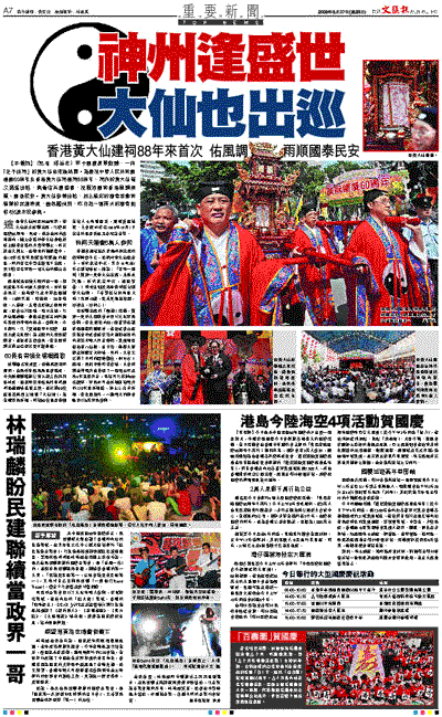 【本報訊】(記者 邱益忠)甲子國慶萬眾歡騰,一向「足不出祠」的黃大仙也來湊熱鬧。為慶祝中華人民共和國建國60周年及香港黃大仙祠建祠88周年,祠內的黃大仙首次擺駕出巡,與善信共慶盛事,祝願祖國和香港風調雨順、國泰民安。黃大仙移鑾出巡,加上精彩的廟會活動和精湛的武術表演,嗇色園預料,昨日起一連兩天的廟會能吸引6萬市民參與。