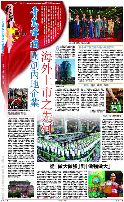 一九九三年下半年,青島啤酒股份有限公司先後在香港、上海兩地上市,不僅開創內地企業海外上市之先河,亦是中國首家在兩地同時上市的公司。馳騁資本市場十六年,青島啤酒目前已成為世界第六大啤酒廠商,產品遠銷美國、日本、德國、法國、英國、意大利、加拿大、巴西、墨西哥等世界六十多個國家和地區。最為難得的是,該公司在全世界範圍內打響了「青島啤酒」這個民族品牌,為新中國的民族復興之路做出了卓越貢獻。