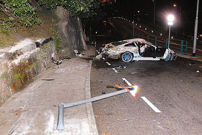 【本報訊】「活學教育中心」創辦人兼英文科百變鬼馬補習天王黎文業,昨凌晨駕駛其名貴保時捷座駕,途經跑馬地半山落斜時失控,衝上如起跳斜台的路中天橋口分隔石壆後,跑車如炮彈飛車般多次撞向路邊護土牆,並翻滾至70米外始停下,車頂壓扁全車盡毀。黎頭部重創被困車內,消防員需剪開車體殘骸將他救出,惜黎送院搶救3句鐘後證實不治,遺下與其一起創業、有「補習天后」之稱的妻子Amanda Tann及稚女。警方正調查意外原因,了解是否車速過高抑或有人打瞌睡肇禍。