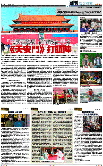 過兩天便是我國建國六十周年紀念,中影集團分別製作了兩齣獻禮電影:一齣是電視、電台、海報宣傳得街知巷聞的《建國大業》,據稱有一百七十多位職業演員參加拍攝,成龍、李連杰、劉德華等國際知名巨星皆參與其中,排山倒海的宣傳攻勢不免掩蓋了「親兄弟」──由葉纓(即葉大鷹)導演拍攝,將於「中國電影展」作為開幕電影的的《天安門》的聲勢。