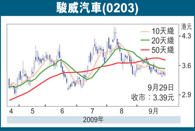儘管比亞迪走勢呈強,但現價市盈率已高達111倍,即使09年預測市盈率也達82倍,若看好內地汽車股的前景,駿威汽車(0203)反而是較可取的捧場選擇。駿威公布的截至今年6月底止上半年業績顯示,集團股東應佔溢利為11.79億元(人民幣,下同),同比下跌4.7%,每股基本收益15.7分,中期息派3分。根據工信部最近公布,內地8月份乘用車銷售85.83萬輛,按年增長90.18%;今年首8個月乘用車累計銷售622.64萬輛,按年增長36.84%。行業下半年的增長勢頭仍佳,駿威業績改善的空間也可看好。