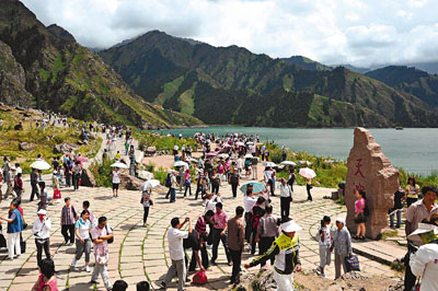 ■距離烏魯木齊最近的5A級景區—新疆天池遊客數量迅速回升。圖為新疆天池景區遊人如織。