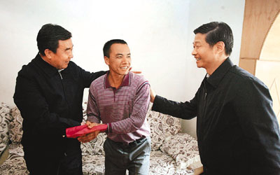 ■朱海侖(右1)慰問少數民族同胞。 梁坤 攝