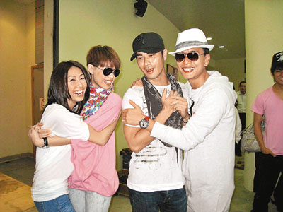 ■(左起)胡定欣、胡杏兒和鄭嘉穎、黃宗澤分別抱著合照,以證「同性相吸」?