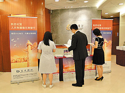人民幣國債在香港開售首兩天,市場認購反應熱烈。交通銀行香港分行副總經理陳霞芳表示:「客戶可首次透過本行網上或電話認購人民幣國債,相信有助刺激產品銷情。於推出人民幣國債發售首天,已有客戶使用網上及電話渠道認購人民幣國債。客戶經過嘗試並取得良好的體驗後,將會傳達有關訊息,本行預料使用網上及電話作認購渠道的客戶將陸續增加。」