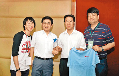 文匯報副總編輯徐可(左二)、社長助理姜增和(右一)及學生代表向河源市委常委、宣傳部部長吳善平(右二)贈送「未來之星」團服。