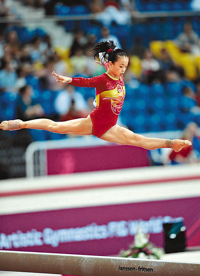 在率先開戰的女子平衡木決賽中,中國選手胡玉虹繼續預賽中的穩定發揮,以14.400分為中國隊獲得首枚金牌。胡玉虹還參加了自由操的決賽,但因落地失誤僅得到13.100分,最終名列第七。