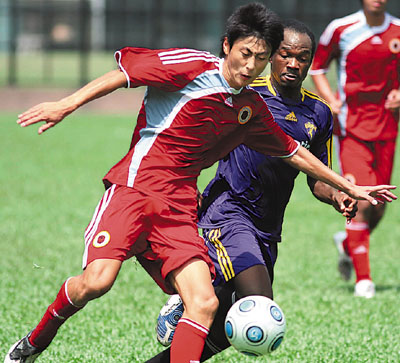 ■港隊友賽飛馬大勝3球。圖為港隊前鋒徐德帥在拚搶。本報記者郭正謙 攝