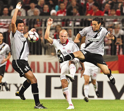 【綜合新華社消息】德甲巨頭拜仁慕尼黑昨晨本應以一場大勝回報安聯球場狂熱的球迷,但無奈前鋒們屢與入球良機失之交臂,翼鋒洛賓還勇戰受傷,無奈的拜仁只得在歐聯A組次輪中接受與意甲勁旅祖雲達斯(祖記)0:0的悶和戰果。