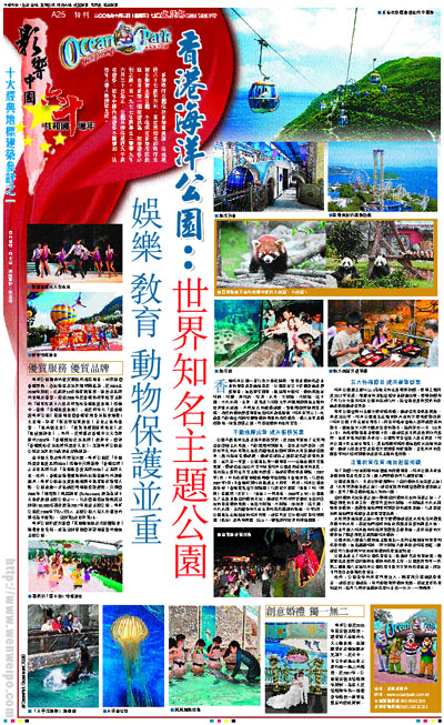 香港海洋公園一直以致力提供娛樂、教育及動物保護並重的項目及設施為目標。公園設有三十多個設施及表演項目,包括架空纜車,遠眺南中國海。動物展館有海豚、海獅、斑海豹、鯊魚、水母、大熊貓、小熊貓、揚子鱷、小爪水獺、金魚、雀鳥及以印度太平洋珊瑚環礁為主題的世界級水族館。不同形式的機動遊戲,緊張刺激與娛樂性兼備。精彩的動物表演項目包括海洋劇場鉅獻「海洋伴我心」,此劇目巧妙融合海豚海獅等動物明星的精彩動作、動人故事及動感節拍,欣賞表演之餘,可認識動物的生活習性。