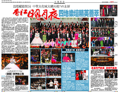 【本報訊】由中華文化城有限公司、香港中華文化總會、中央電視台、香港電視廣播有限公司主辦,香港文匯報協辦,中央人民政府駐香港特別行政區聯絡辦公室宣傳文體部、文化部港澳台文化事務司、中國文聯港澳台辦公室特別支持,中國對外文化集團公司籌組的「慶祝建國60周年暨第10屆香江明月夜大型中秋晚會」,一連3場於香港文化中心音樂廳舉行,中國國家交響樂團首度與來自香港、台灣、澳門、深圳、廣州的合唱團,著名歌手、音樂演奏家逾300人聯手,為香港觀眾呈上了高品味的音樂盛宴。